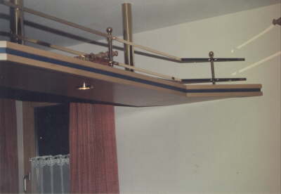 Abhängung mit MessingrohrenIntarsienähnlich eingelegter Schmuckstreifen in marineblauintegrierte Halogenbeleuchtung