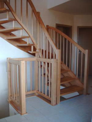 halbgewendelte Treppe in Bucheschlichte, aber ansprechende AusführungGeländerstäbe als Rundstäbe